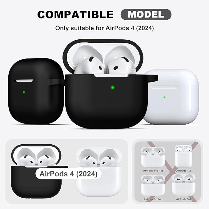 R-fun for AirPods 4th Case Cover with Cleaner Kit, Soft Skin Silicone Case Cover with Keychain, Full Protective Case for Men and Women, Compatible with Apple Latest AirPods 4 Case 2024, Black