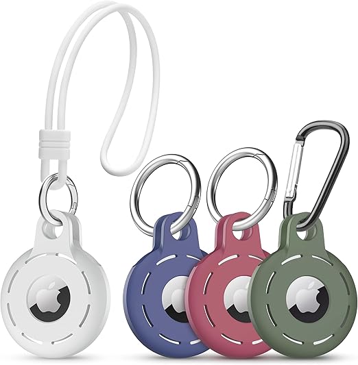 [4 Pack] Silicone Soft Protective Case for AirTag Holder with Sound Holes and Keychain Hook Strap, Safety Anti-Lost Portable Easy to Attach to Bags, Keys, Pet Collars, Blue White red Green