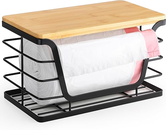 - EASY TO USE: The trash bag holder has a large front opening for easy access to items. It can be placed on the counter next to the kitchen garbage can or under the sink, great for kitchen sized bags. In addition, other items can be stacked on top of the bamboo cover to save more space! Perfect for any countertop, cabinet or rv