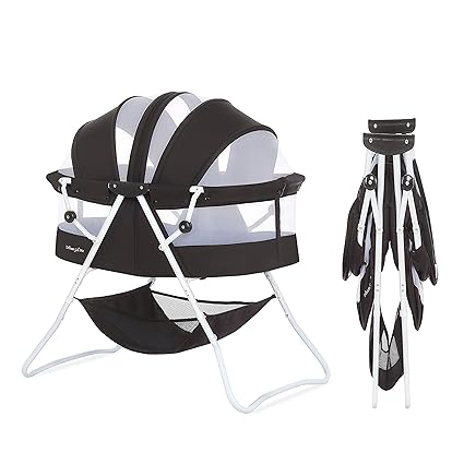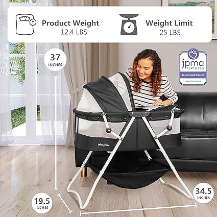 Karley Bassinet in Black, Lightweight Portable Baby Bassinet, Quick Fold and Easy to Carry , Adjustable Double Canopy, Indoor and Outdoor Bassinet with Large Storage Basket.