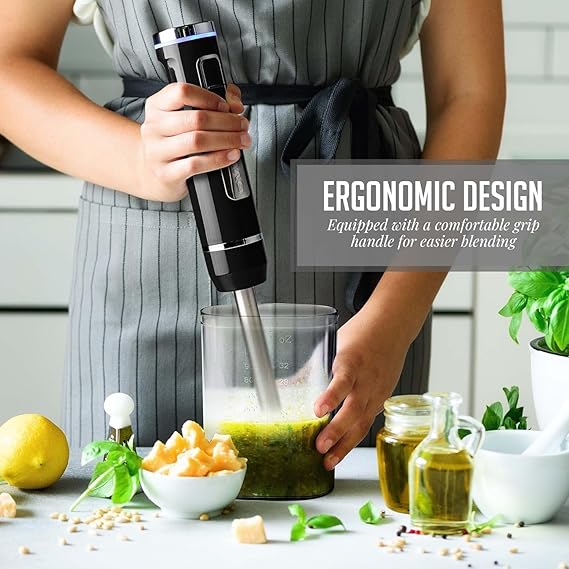 - ERGONOMIC DESIGN – Powered by a 200-Watt motor and featuring 8-speed settings, this hand blender offers precise control for making salsas, shakes, smoothies, and more. It ensures an exceptional cooking and blending experience while adding a sleek, modern touch to your kitchen.