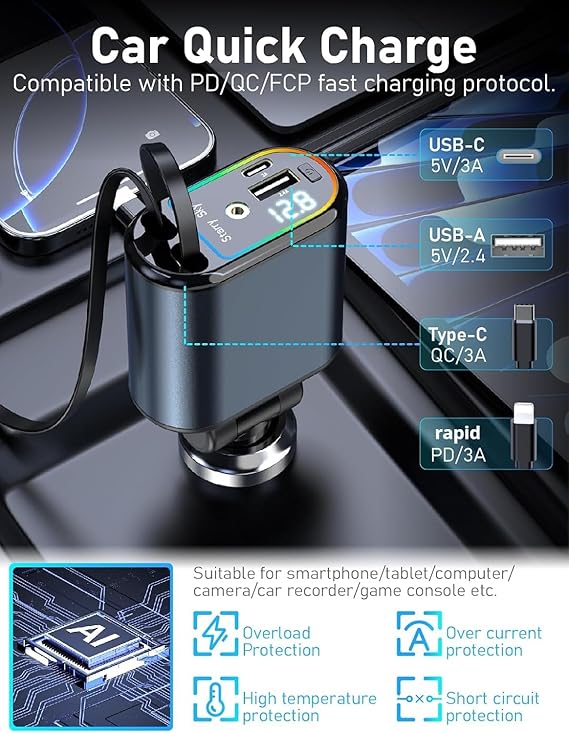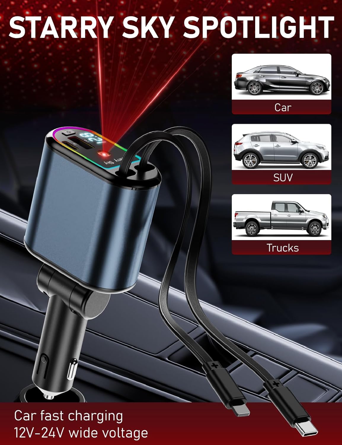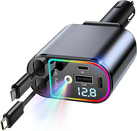 - I. MULTI-DEVICE CHARGING: The LWW 4-in-1 Retractable Starlight Car Charger with 2 USB ports (USB A+C) and 2 retractable cables (USB C+L) allows you to charge multiple devices at the same time. It makes an excellent car accessory, perfect for smartphones and a stylish gift for drivers. This charger ensures fast and efficient charging while helping to keep your car or truck neat and organized.