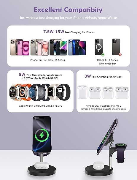 - 3 In 1 Mag-Safe Charger Stand – Aeinidi 3 in 1 charging station for apple is a magsafe charger stand for efficient wireless charging of iPhones, Apple Watches and AirPods. With this innovative charging stand, you no longer have to search for multiple chargers or deal with a cluttered desktop. Say goodbye to clutter and hello to convenience!