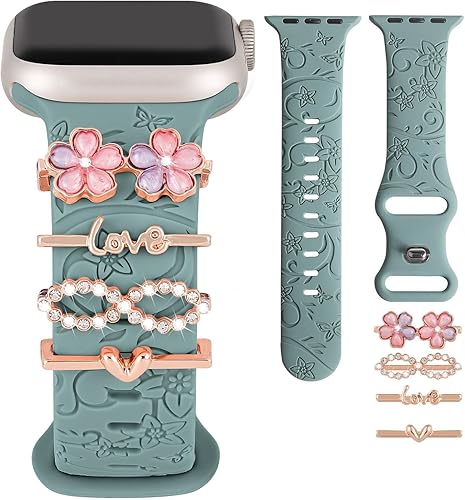 Charm+Band for Apple Watch Bands 40mm 41mm 38mm 44mm 45mm 46mm 42mm For Women Men,Floral Engraved Silicone Sport Band+Decorative Ring Loops for iWatch Series 10 9 8 7 6 5 4 3 SE Ultra/2 49mm Strap