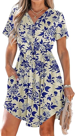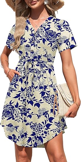 • 【Design features】: Sexy V-neck short-sleeves T-shirt dress, unique button front and drawstring waist design more feminine, side pockets easy to carry small accessories, above the knee mini dress with high and low hemline, is a unique casual suit, but also chic beach dress, flowy sundress.