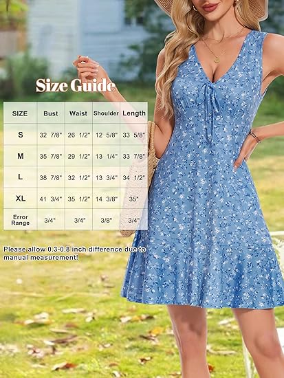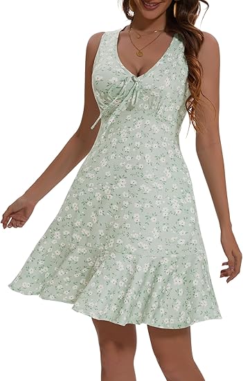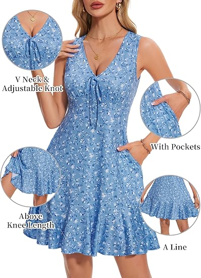 - Features:This sleeveless mini dress features a V neck with a Fixed Bow Decoration, adding charm and elegance. The A line cut creates a flattering, flowy silhouette. Practical pockets add convenience, while the floral print enhances the design.