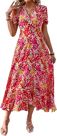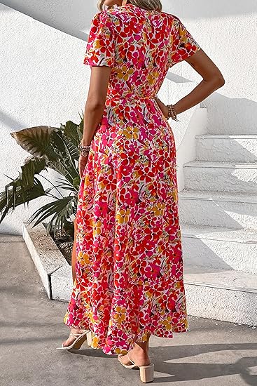 - Features: Maxi Dress For Women Features Sexy Wrap V Neck, Short Sleeve, Relaxed Fit, High Waist, Allover Floral, Polk Dot Print, Full Length Long Maxi Dress , Asymmetric Ruffle Trim At The Bottom, High Split At One Side, Wrap Belt At The Waist