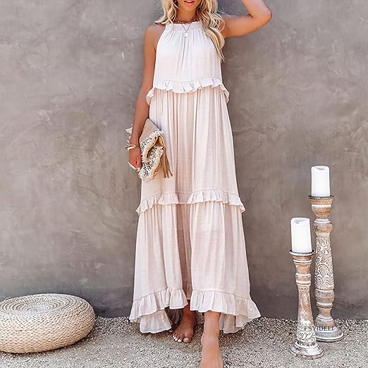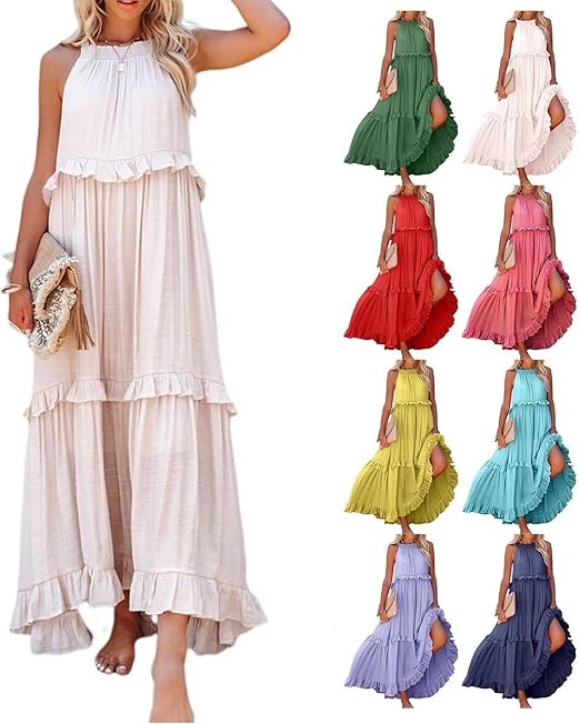 Women’s Maxi Dress 2025 Spring Casual Loose Swing Boho Smocked Ruffle Sundress Halter Sleeveless Tiered Beach Dress