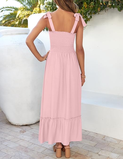 - Bohemian dress features a straight neckline, tie-up ribbon straps, pretty floral print, shirred and stretchy bodice, perfect ankle length, the subtle tiered detailing to skirt styles this piece perfectly.