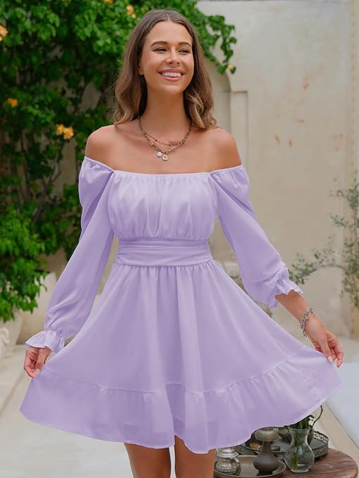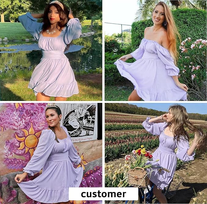- Feature: tie back, open back, square collar, ruched bust, smocked waist, elastic high waist, lantern sleeve, long sleeve, elastic cuff, above knee length, A line, slim fit, swing and elegant vintage chiffon dress.