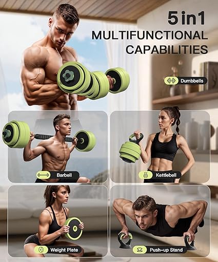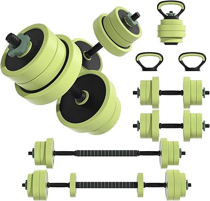 - Note: All dumbbell pieces weigh with all accessories weigh for a total weight of 45LBS. You will get 2.75LBS*8+5LBS*4 pieces plates, 2 dumbbell bars, 2 kettlebell handles, 1 kettlebell base, 1 barbell connecting and 5 pieces of nuts.