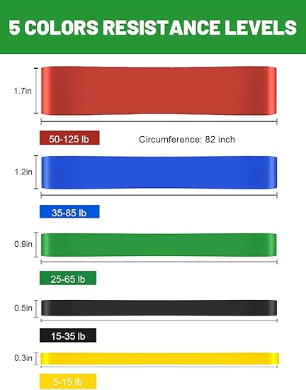 - Package Included: 5 pull up bands, 1 carrying bag and 1 workout guide. Resistance bands are 8-15 lbs, 15-35 lbs, 25-65 lbs, 35-85 lbs, 50-125 lbs. Use these exercise bands to perform rows, pulls, raises, and fly workout sets to exercise your arms, back, hips, legs, chest, and abdominal region