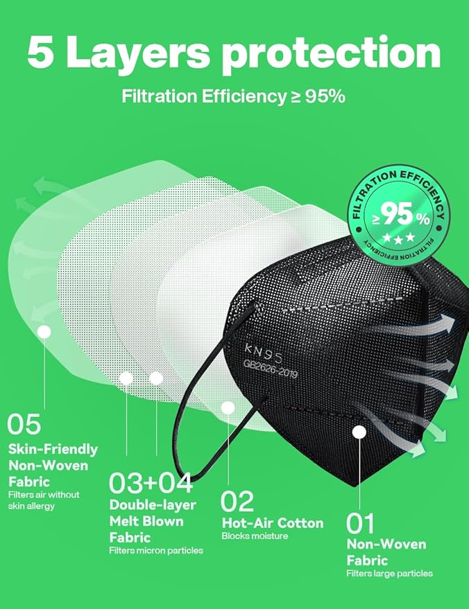 Boncare KN95 Face Masks, Black KN95 Masks 60 Pack, 5-Layer Face Masks