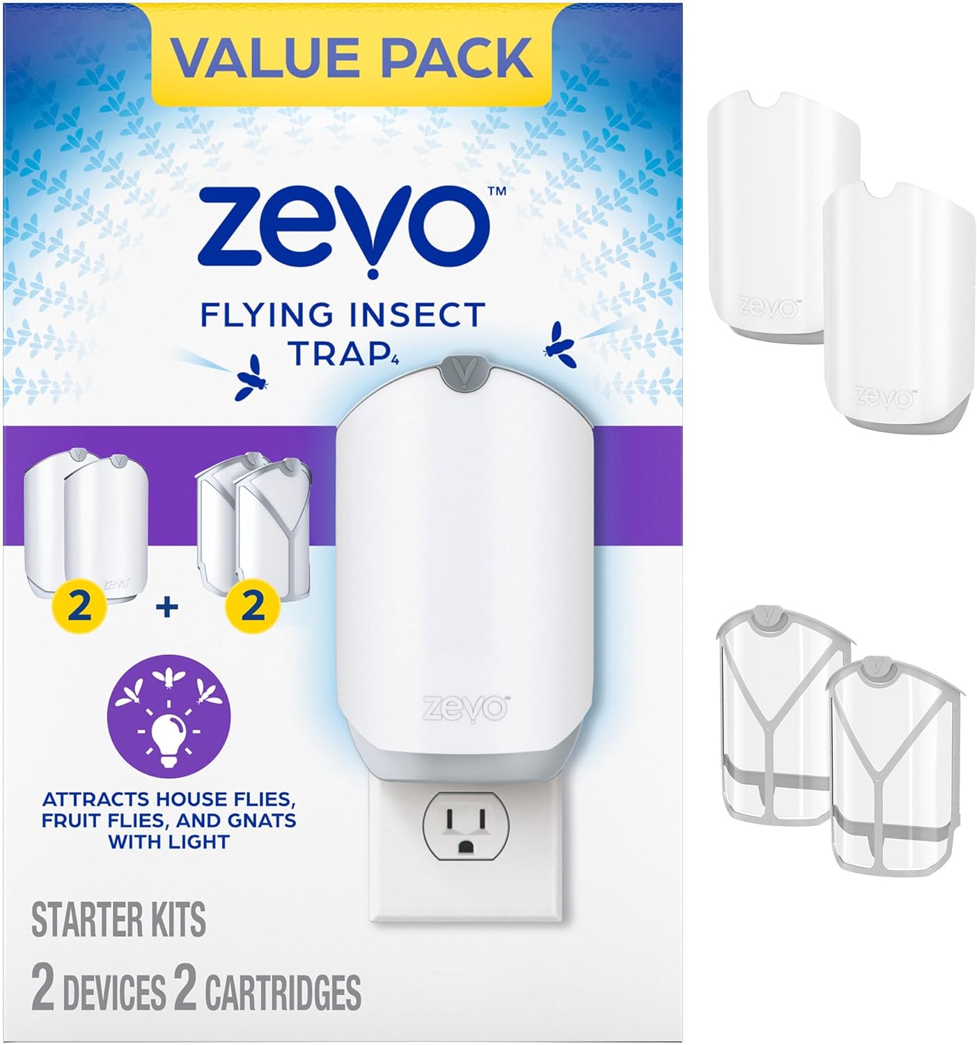 Zevo Flying Insect Trap for Indoors: Light Trap Captures Fruit Flies, Gnats and Houseflies, Starter Kit Value Pack (2 Plug-in Bases + 2 Cartridges)
