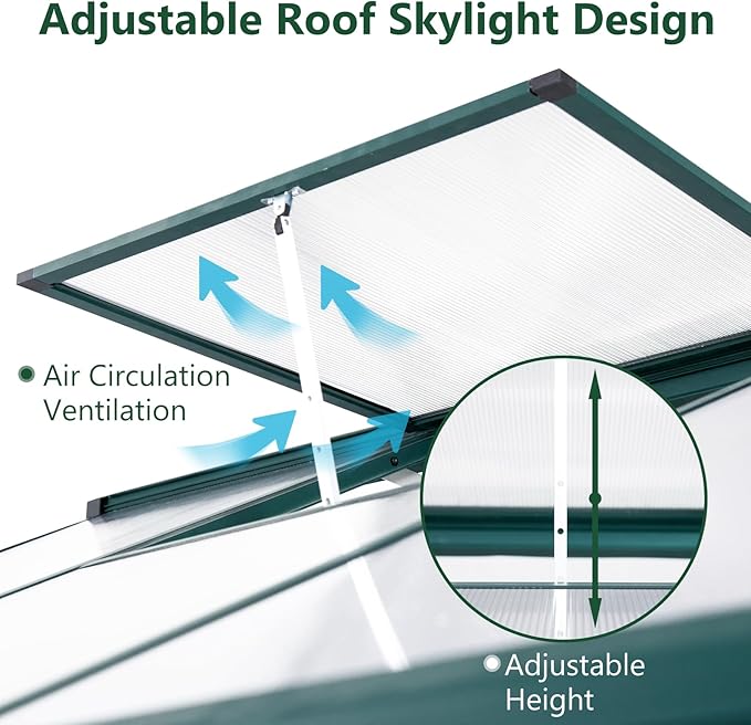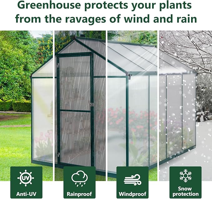 - 【Thickened and Durable Anti-UV Board】4mm double-walled translucent polycarbonate roof panels combined with crystal clear shatterproof PC wall panels balance the light, humidity and temperature in the greenhouse, which can block ultraviolet rays and provide the most suitable environment for plant growth
