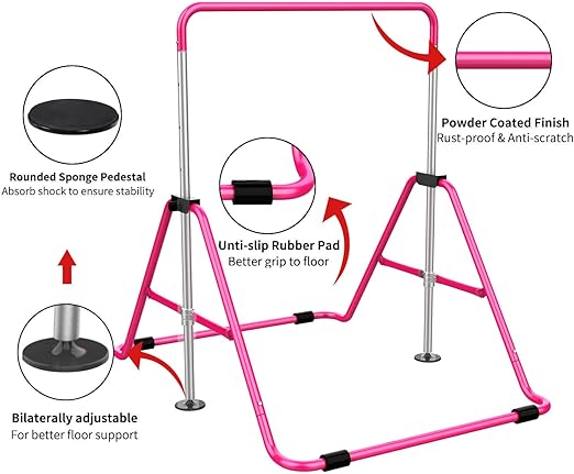 - PROVIDE GYMNASTICS BAR PAD – You will get a gymnastics bar pad which you can attach on the top bar of this folding gymnastics bar. Soft pads can prevent hips, stomach, and legs from hitting the hard bar during training, that will help kids learn more skills with more comfort!