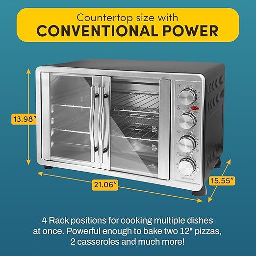 Elite Gourmet ETO-4510M French Door 47.5Qt, 18-Slice Convection Oven 4-Control Knobs, Bake Broil Toast Rotisserie Keep Warm, Includes 2 x 14″ Pizza Racks, Stainless Stee