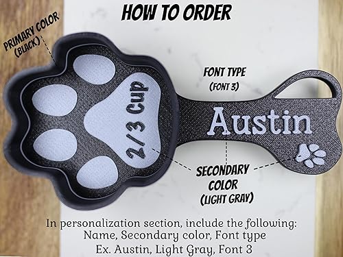 • Customized Just for Your Pup: Crafted with love and precision, each scoop is uniquely personalized with your dog’s name elegantly printed on the handle in a contrasting, eye-catching color. Say goodbye to mix-ups at feeding time and add a personal touch to your pet care routine.
