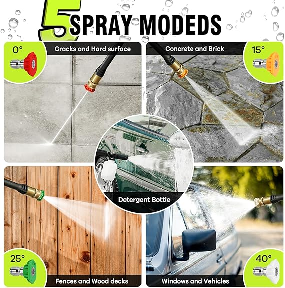 - 【MULTI-FUNCTIONAL USE】The Power Washer is equipped with four quick-connect metal spray nozzles (water-pressure strength:0°>15°> 25°> 40°) and a foam cannon. 4 metal nozzles with different pressure strengths for different application scenarios to meet your cleaning needs. The detergent bottle can be filled with chemicals such as bleach, the cleaner will not pass through the pump, so you do