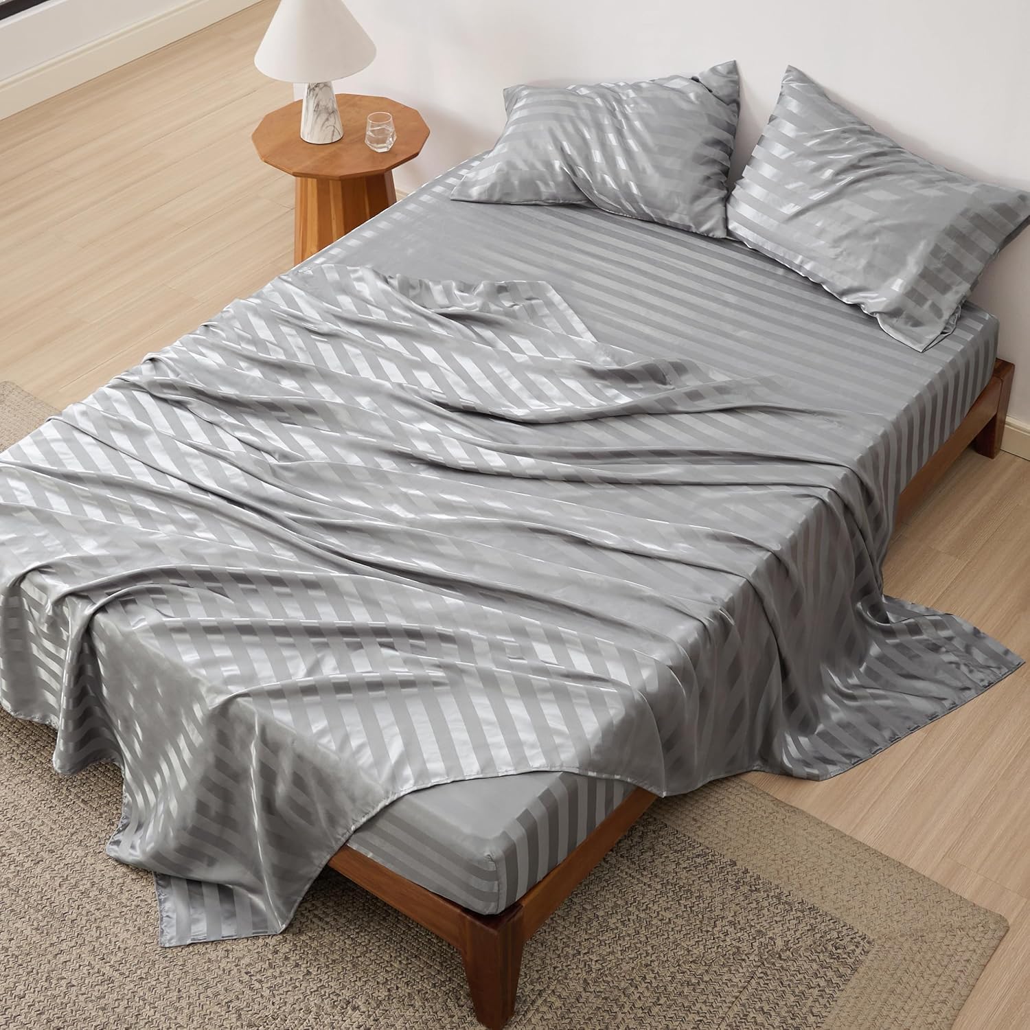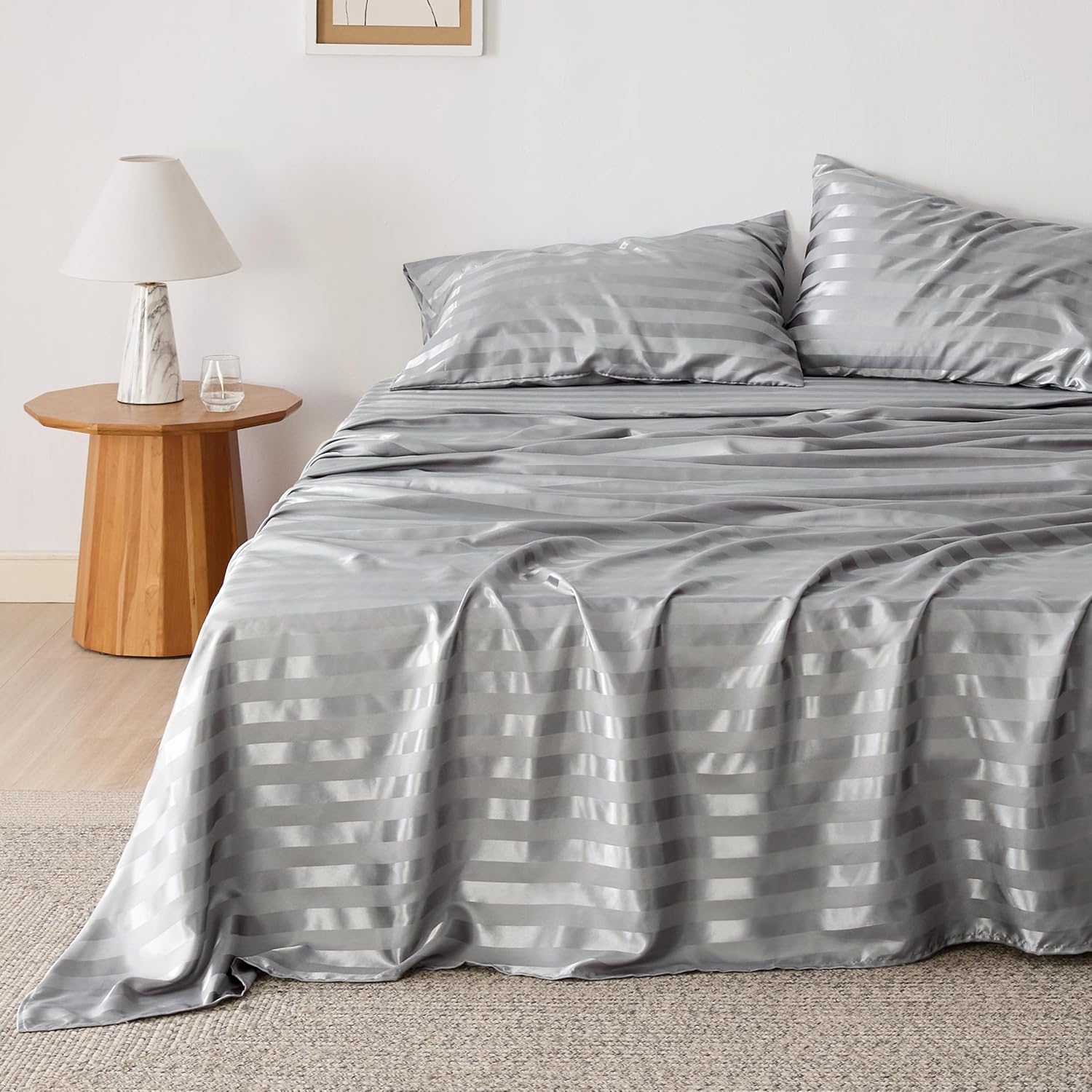 Bedsure Satin Sheets – Soft Satin King Sheets Set, 4 Pcs Luxury Silky Sheets, Similar to Silk Sheets, Grey Satin Sheets King for Hair and Skin, Gifts for Women (Grey Striped, King)