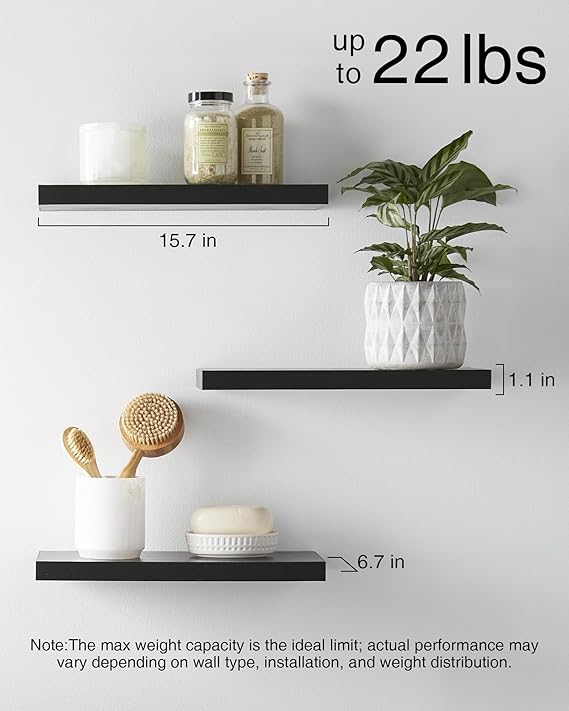 BAYKA Floating Shelves for Wall, Wall Mounted Rustic Wood Shelves for Bathroom, Bedroom, Living Room, Kitchen, Hanging Shelf for Books/Storage/Room Decor with 22lbs Capacity (Black, Set of 3, 15.7in)