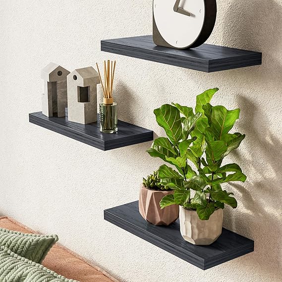 • Rustic Wood Floating Shelves: Crafted from engineered wood with a matte black finish, these stylish wall-mounted shelves offer a country rustic look for your living space.