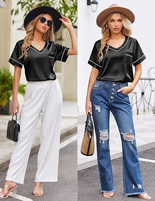 • Short Sleeve Top: V neck, soild color, smooth satin top with chest pocket. The loose cut can show your body curve while giving you a burden-free wearing experience