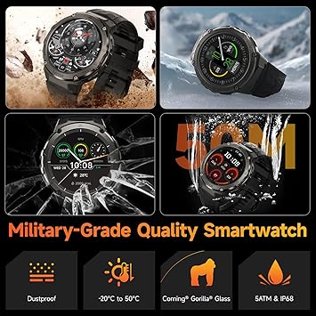 - Military Grade & 5ATM Waterproof Smartwatch for Men: Built to endure extreme conditions, from -20°C snow hikes to 50m pool dives. Metal frame + Gorilla Glass shield against rock climbs. Perfect for swimmers, gym-goers, and adventurers who need a reliable companion for all weather and water activities