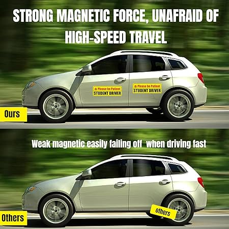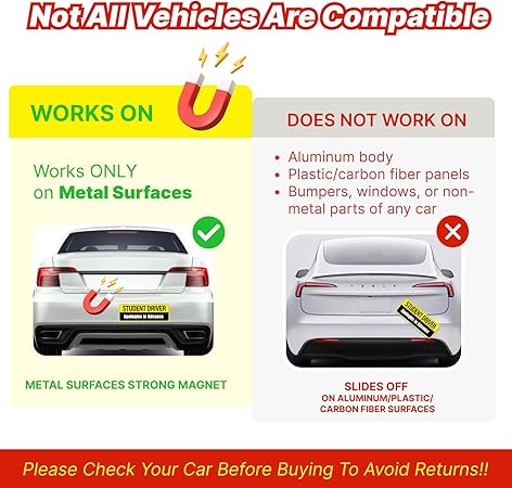 • METAL-ONLY MAGNETS: These student driver magnets adhere ONLY to metal surfaces and are not suitable for fiberglass, aluminum, or plastic parts, nor on damaged areas. Please confirm that your vehicle is metal-based before ordering