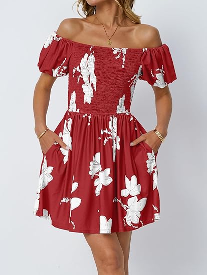 - Feature:This women’s dress is a stunning combination of elegance and comfort. It features an off-the-shoulder neckline that gracefully frames your shoulders, paired with charming short puffy sleeves that add a touch of playfulness.High-waisted, tummy-skimming design accentuates your figure. The beautiful floral pattern adds a vibrant touch, perfect for sunny days and parties.