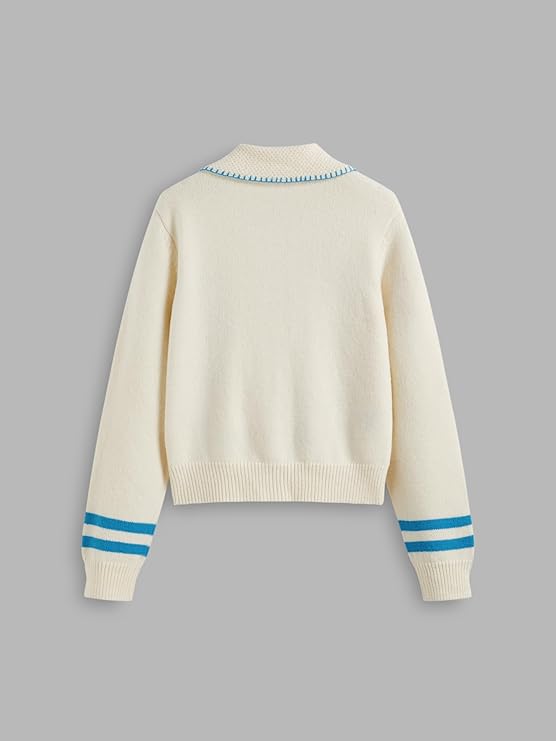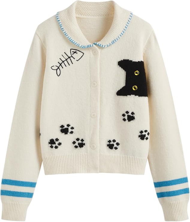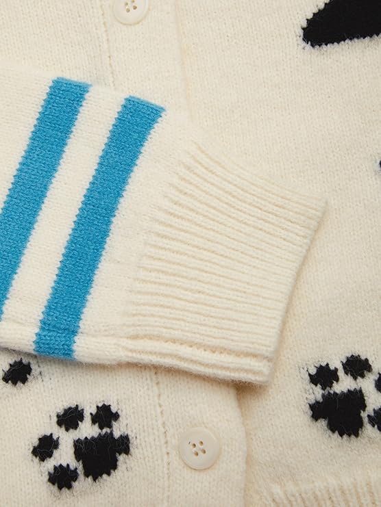 - Charming Design: This cardigan showcases adorable animal paw prints and graphic details, offering a unique and playful look perfect for casual daily wear. The knit collar with blue trimming adds a touch of vintage charm that complements the overall design beautifully.