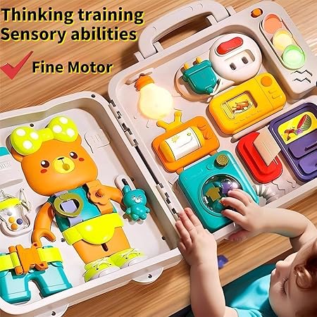 - Montessori toys for 1 year old- busy boardhas three interactive sides filled with a variety of fun activities such as unlockable doors, shoelace tying, sliding windows and more. This sensory toy is perfect for toddlers aged 1 to 3 years old, enhancing their fine motor skills and helping them learn to handle everyday objects in a fun and educational way.