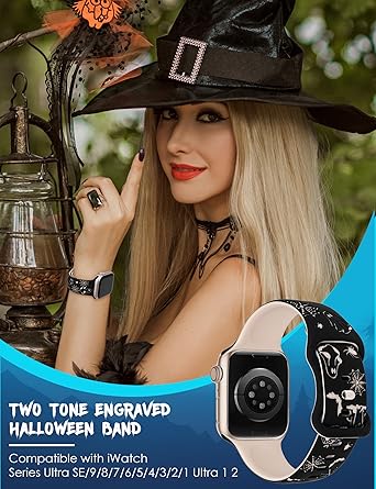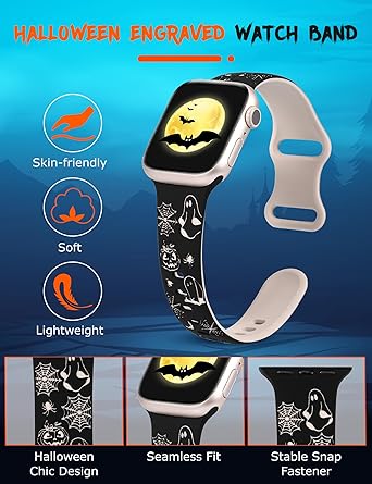 - Premium Silicone Material The halloween engraved band compatible with apple watch band is made of premium soft silicone, offers a luxurious feel and exceptional durability. Experience ultimate comfort on your wrist while enjoying the confidence of a long-lasting accessory that withstands daily wear and tear. Indulge in the irritation-free, soft feel of our premium silicone watch band